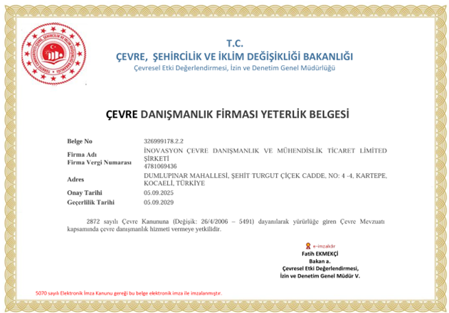 İNOVASYON ÇEVRE olarak Çevre Danışmanlığı konusunda Çevre Şehircilik ve İklim Değişikliği Bakanlığı’ndan almış olduğumuz yeterlik ile uzman kadromuzla hizmet vermekteyiz.