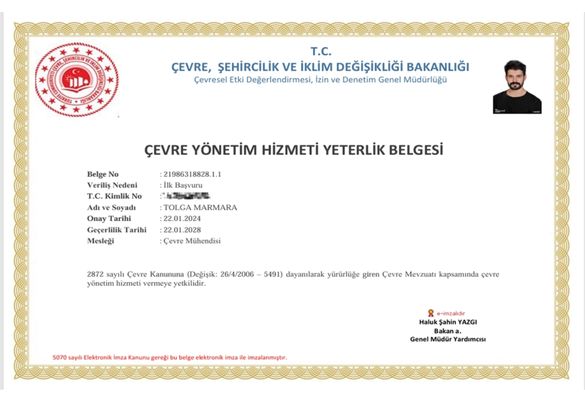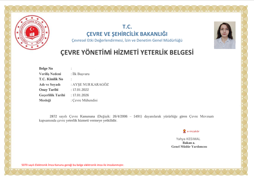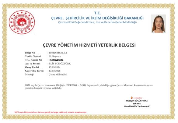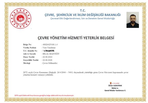 • Mesleğimde kendimi geliştirmeye önem veriyorum; çevre yönetimi, atıksu arıtma ve çevresel denetim konularında çeşitli yetkinlik belgelerine sahibim. Çevre Yönetimi Hizmeti Yeterlik Belgesi ve Atıksu Arıtma Tesisi Tesis Sorumlusu belgeleri gibi mesleki yetkinlik belgelerine sahibim.