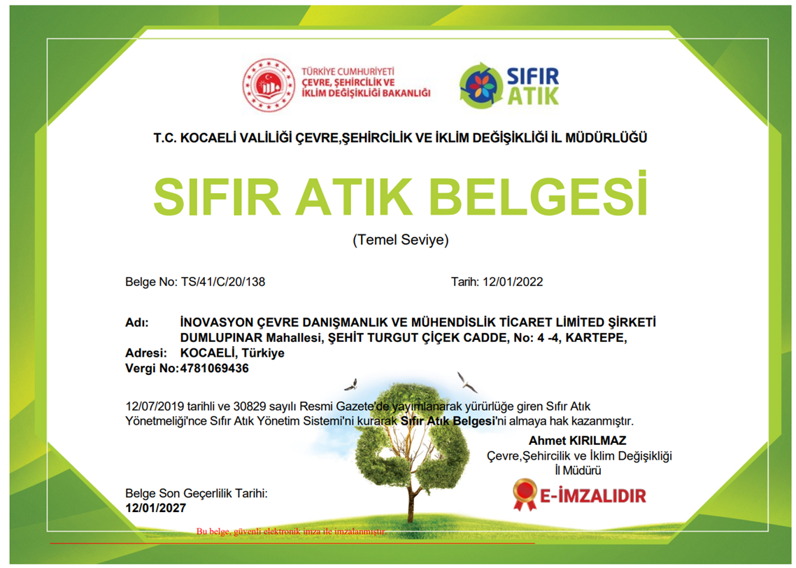 Ayrıca İNOVASYON ÇEVRE, 2022 yılında Sıfır Atık Belgesi almış bir firmadır.